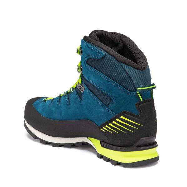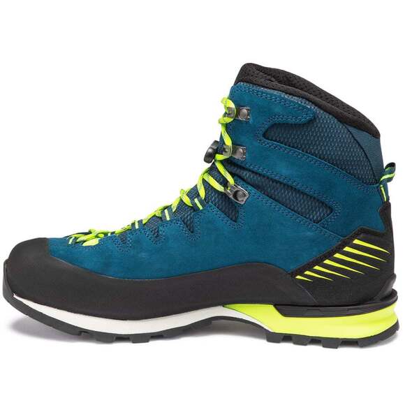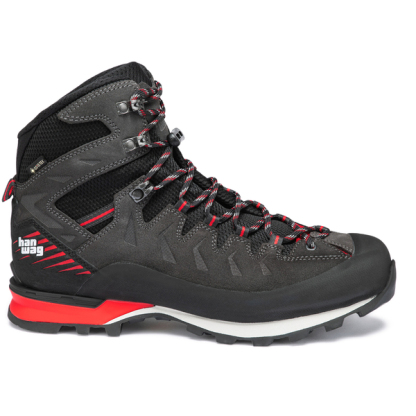 Makra Pro GTX to buty idealne na wymagające wędrówki górskie po lodowcach. ale także na łatwe letnie wędrówki górskie i kamieniste drogi. Ten lekki. wytrzymały but wszechstronny ma lekką. hydrofobową membranę GORE-TEX i wytrzymałą cholewkę ze skóry Perwanger. Zastosowaliśmy połączenie PU. TPU i EVA. aby uzyskać lekką. ale wyjątkowo stabilną podeszwę środkową. PU w pięcie zapewnia doskonałą amortyzację. zintegrowana rama TPU Cat zapewnia bezpieczne trzymanie. a EVA w przedniej części stopy zapewnia większą precyzję. Podeszwa Vibram® Makra zapewnia doskonałą przyczepność. Razem tworzą drużynę marzeń. „Hanwag 2 Zone Lock” z mechanicznym sznurowaniem poprawia przyczepność na pięcie. W przeciwieństwie do tradycyjnych haczyków do sznurowadeł. mechaniczne blokady sznurowadeł pozostają na miejscu i nie przesuwają się. chyba że zostaną ręcznie wyregulowane. Szczególną cechą kolekcji Makra są zoptymalizowane sznurowadła Ghyly. które przechodzą przez pętelki z materiału tekstylnego i sięgają do obszaru palców. Zapewnia to bezpieczne dopasowanie do przedniej części stopy i zapewnia dobrą ogólną stabilność w modelach o średnim wycięciu. Alpine Wide zapewnia więcej miejsca w przedniej części stopy. co przekłada się na większy komfort bez utraty precyzji i wydajności podczas wspinaczki.
